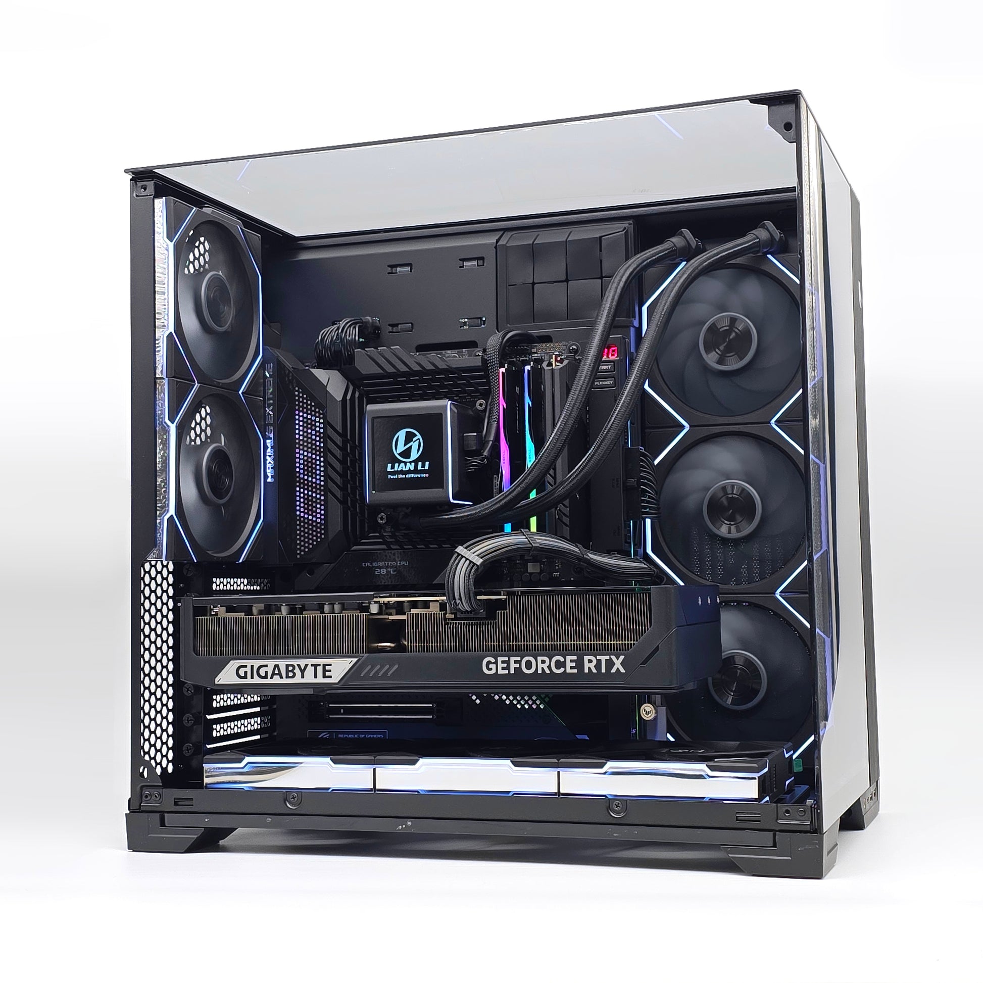 CASE: Lian Li O11 Vision Black Compact Tempered Glass Panoramic Mid Tower (Tempered glass side panel removed for photos)